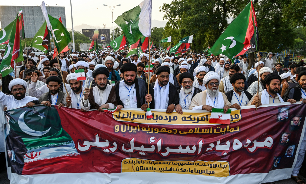 Foto de Aamir QURESHI / AFP Muçulmanos xiitas do Majlis Wahdat-e-Muslimeen (MWM) marcham durante um protesto anti-Israel em Islamabad, em 17 de junho de 2025, em meio ao conflito entre Israel e o Irã. (Foto de Aamir QURESHI / AFP)