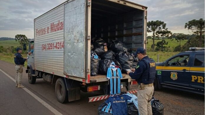 Uma operação da Polícia Rodoviária Federal (PRF) resultou na apreensão de um caminhão carregado com camisas do Grêmio sem nota fiscal ou documentação regular no interior do Rio Grande do Sul. A abordagem ocorreu na BR-285, em Passo Fundo, durante uma fiscalização de rotina.