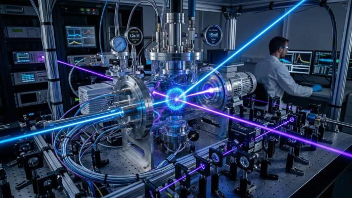 🔦 Alinhamento por Laser: Feixes de luz de alta precisão organizam as partículas em uma grade cristalina rígida.