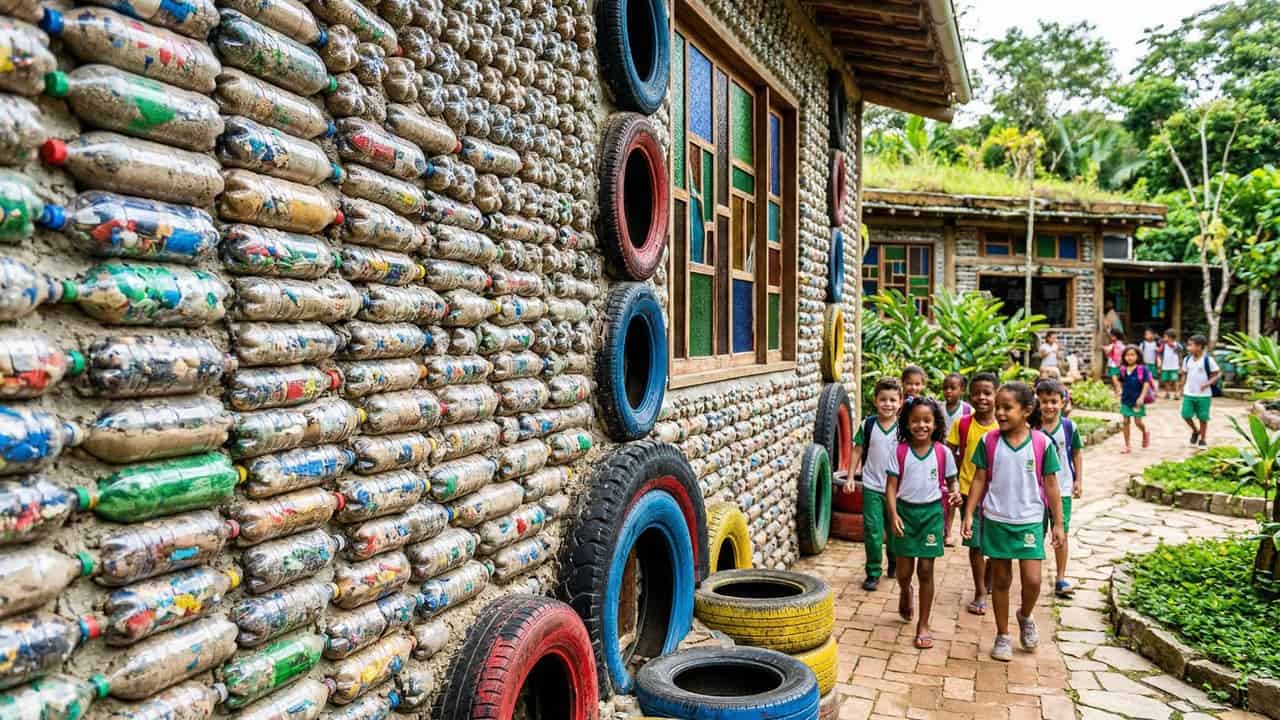 Segundo reportagem publicada pela Nature, iniciativas de construções sustentáveis começaram a crescer quando arquitetos e educadores perceberam que escolas poderiam servir como laboratórios de sustentabilidade. Assim, projetos passaram a utilizar garrafas plásticas, pneus, vidro reutilizado e até latas de alumínio em suas estruturas. Portanto, a própria escola se transforma em ferramenta de aprendizado ambiental.