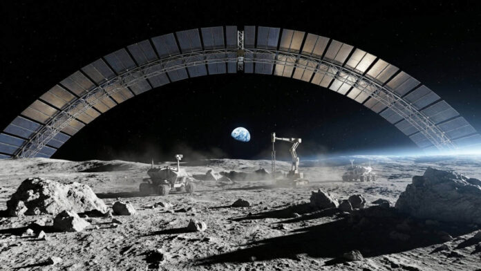 Robôs autônomos usarão recursos lunares para montar infraestrutura de captação solar contínua – Imagem criada por inteligência artificial (ChatGPT / Olhar Digital)
