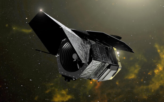 Ilustração do Telescópio Espacial Nancy Grace Roman da NASA escaneando o Universo – Crédito: NASA